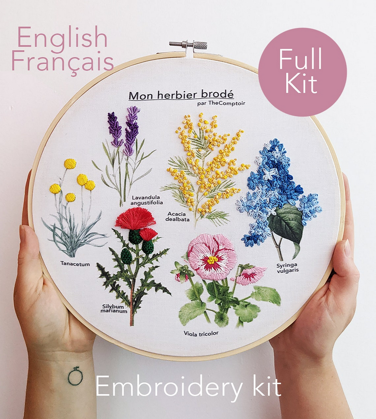 This is an embroidery kit, including everything you need to complete your project. Thanks to this kit you are going to learn 6 embroidery stitches. All the explanations, from A to Z are coming in a 24 pages booklet. The booklet can be printed or PDF. It's going to explain everything you need to know from how to put the fabric in the hoop to how finish the back.