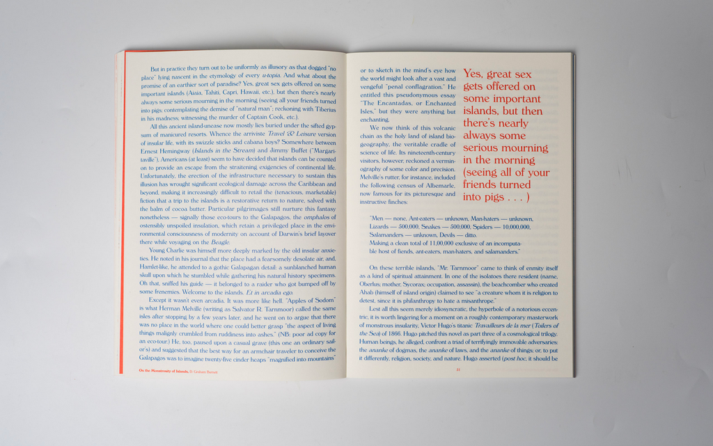 Why tell you this? You probably bought this magazine to browse on Avlaki beach, as reading material to quiet the mind on its inevitable slide toward a delicious summer nap. It can be that too — and you should do that still. But perhaps also allow yourself to remember that coastlines are where hybrid forms like the Hydra are wont to dwell . . . in those choppy transitions between land and sea, firmness and indistinction, wakefulness and sleep.