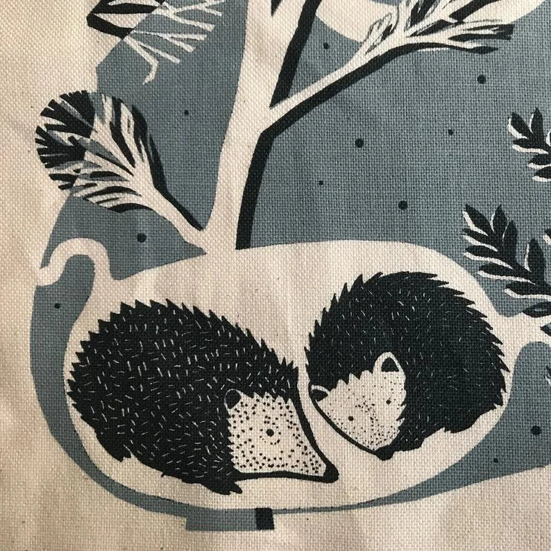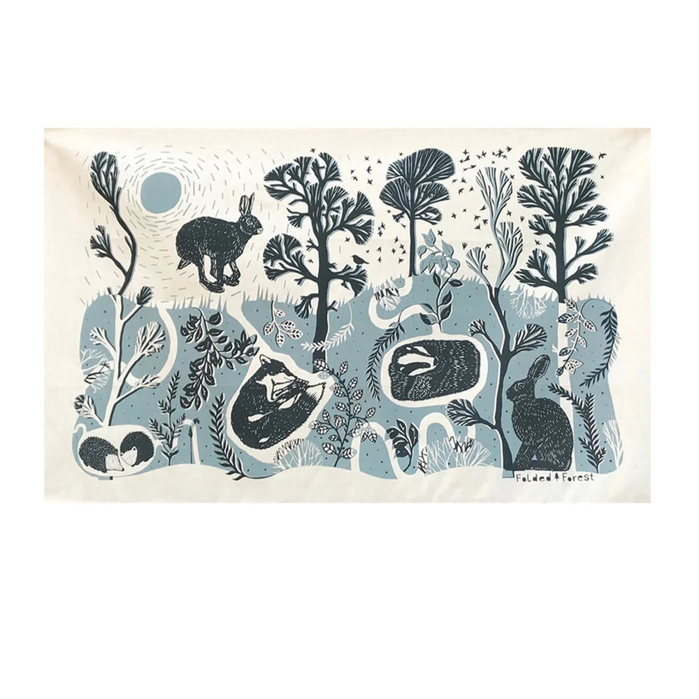 This natural cotton tea towel has been screen printed with our original paper cut design. A leaping hare against the setting sun, a badger and fox sleeping snugly underground.