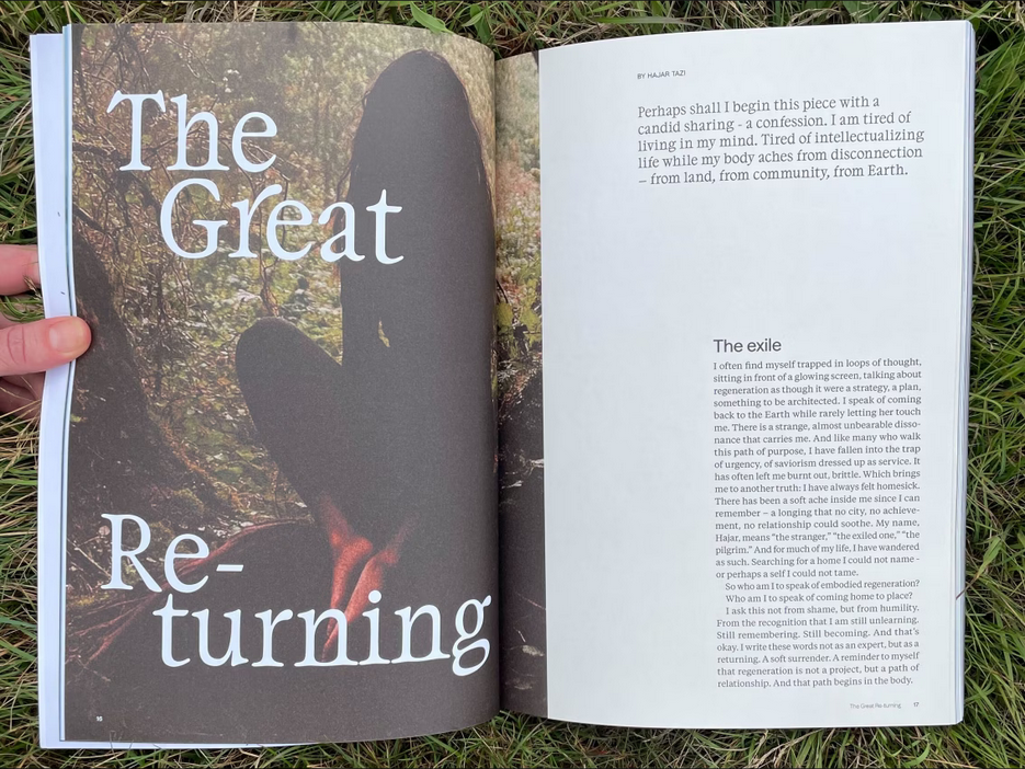 Issue 01 - Returning to Place: This initial issue invites us to reimagine our relationship with the living world through the lens of regeneration. For millennia, humans lived in reciprocity with land, water, and kin; in the blink of history, we forgot. This first volume of Meander asks: how can we remember, and reinterpret these ways of living for future generations?