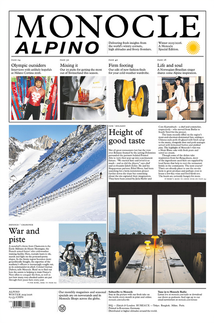 Pick up a copy of Monocle’s winter newspaper, Alpino, today. We meet the unlikely Olympians preparing to hit the slopes at Milano Cortina, sit down with Norwegian-Brazilian singer Charlotte Dos Santos to discuss her Alpine-inspired new release and share 25 tips on where to eat, drink and stay in Switzerland. Plus: why you should book a table at Bolzano’s Pramol Alto.