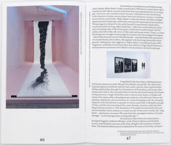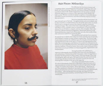 Hair Pieces features artworks by Marina Abramović, Francis Alÿs, Janine Antoni, Georgia Banks, Polly Borland, Sonia Boyce, Christina May Carey, Sadie Chandler, Debris Facility Pty Ltd, Edith Dekyndt, Karla Dickens, Jim Dine, Peter Ellis, Tarryn Gill, Mona Hatoum, Lou Hubbard, Jiang Jian, Nusra Latif Qureshi, John Meade, Ana Mendieta, Hayley Millar Baker, SJ Norman, J.D. ‘Okhai Ojeikere, Patricia Piccinini, Rosslynd Piggott, Wes Placek, C.J. Pyle, Chunxiao Qu, Julie Rrap, Shih Yung-Chun, Charlie Sofo, Christian Thompson, Kemang Wa Lehulere, Louise Weaver, William Wegman, Helen Wright, Ulay, Ai Yamaguchi, and Zhang Chun Hong; and texts by Santilla Chingaipe, Justin Clemens, Lisa Gorton, Melissa Keys, and SJ Norman.