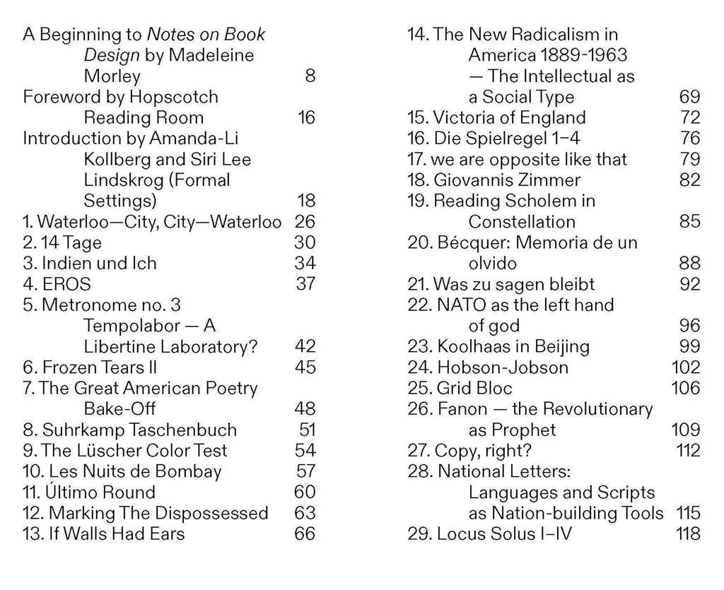 Fifty readings on book design, authored by Siri Lee Lindskrog and Amanda-Li Kollberg of Formal Settings, unfold across the pages of this volume. Drawn from a curated selection of titles in the private collection of the Hopscotch Reading Room – a conceptual bookshop and event space in Berlin – each text focuses on a single book, examining its visual and tactile qualities, from materials and layout to binding and typography. “Our aim is to understand the role and potential of books through a design lens, mapping what they communicate through their physical form.”