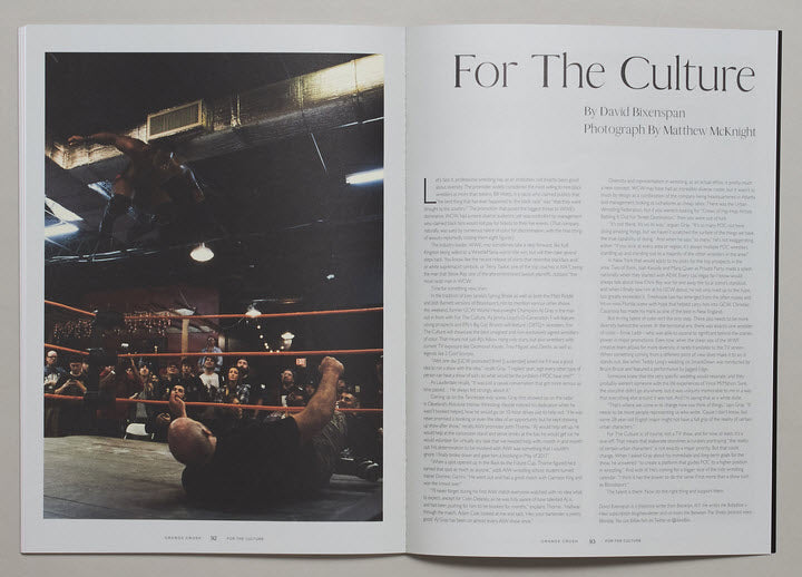 A full-color, 100-page, perfect-bound book, comprising work from a network of artists, writers, and contributors focused on the intersection of visual art and professional wrestling.