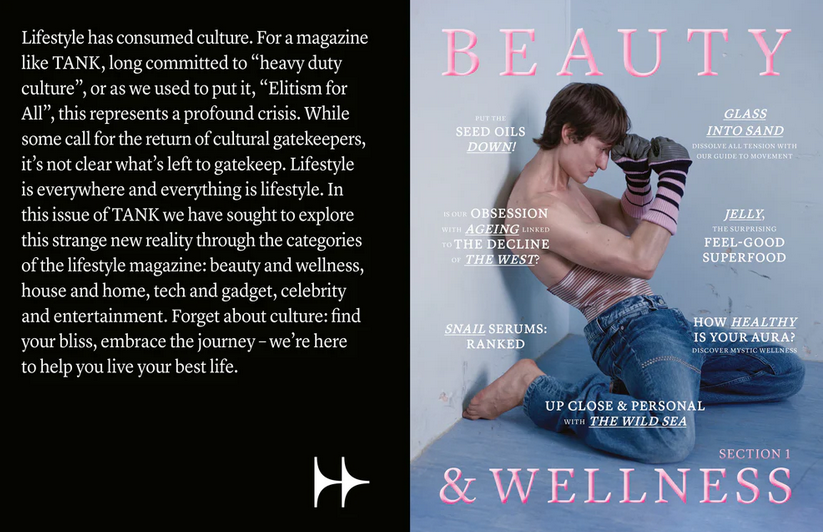 The self-proclaimed ‘heavy duty culture’ magazine tries its hand at lifestyle content for its Autumn 2025 issue—once again positioning itself at the forefront of contemporary culture. Of course, it wouldn’t be Tank without a tongue-in-cheek twist, ciphering astute cultural criticism through traditional lifestyle categories, from interiors, beauty and wellness to entertainment, technology, and celebrity gossip.