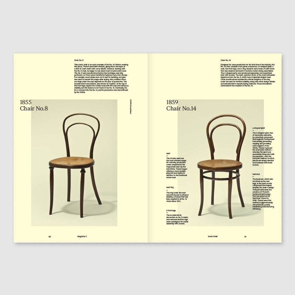 Magazine C is a quarterly documentary magazine that highlights an iconic chair in each issue, exploring its design significance and the lifestyles surrounding it.