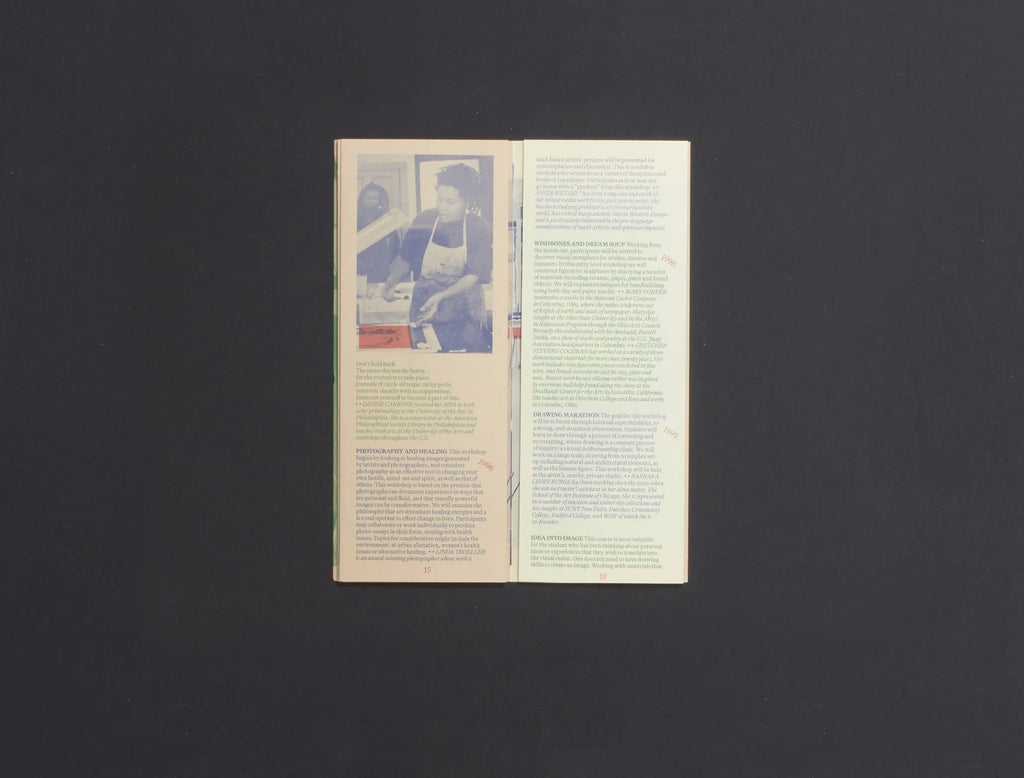 In addition to teaching studio skills such as papermaking, printmaking, and book arts, Women’s Studio Workshop (WSW) has offered workshops that are more experimental, personal, conceptual, or exploratory in nature, rooted in self-observation, inquiry, listening, embodiment, performance, study, and dreams. Here are a few in their original form as they were published in WSW newsletters and Summer Art Institute catalogs from 1983–1999.