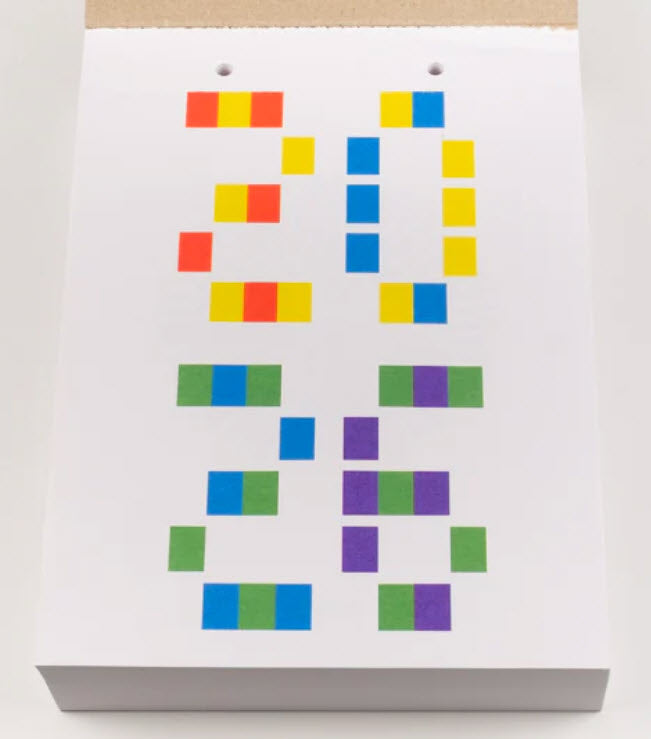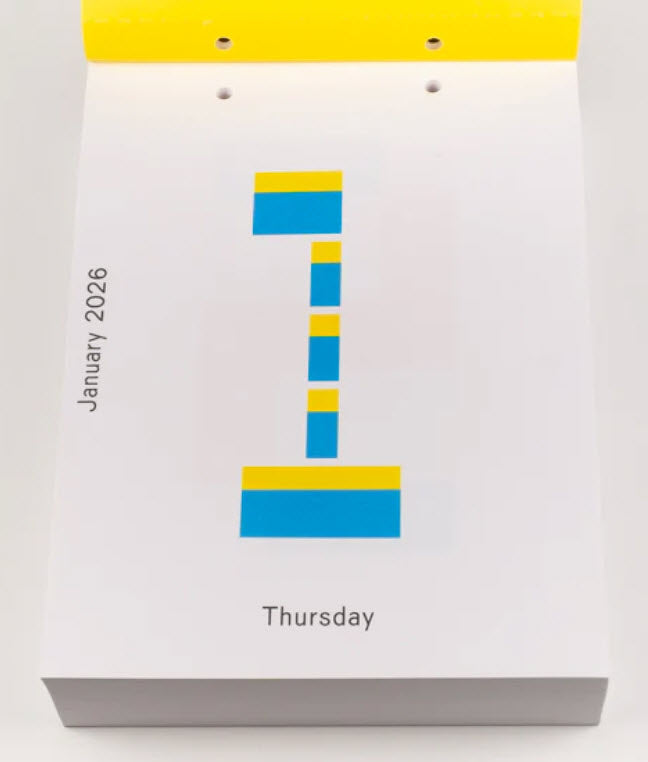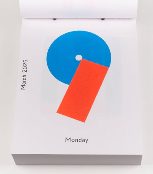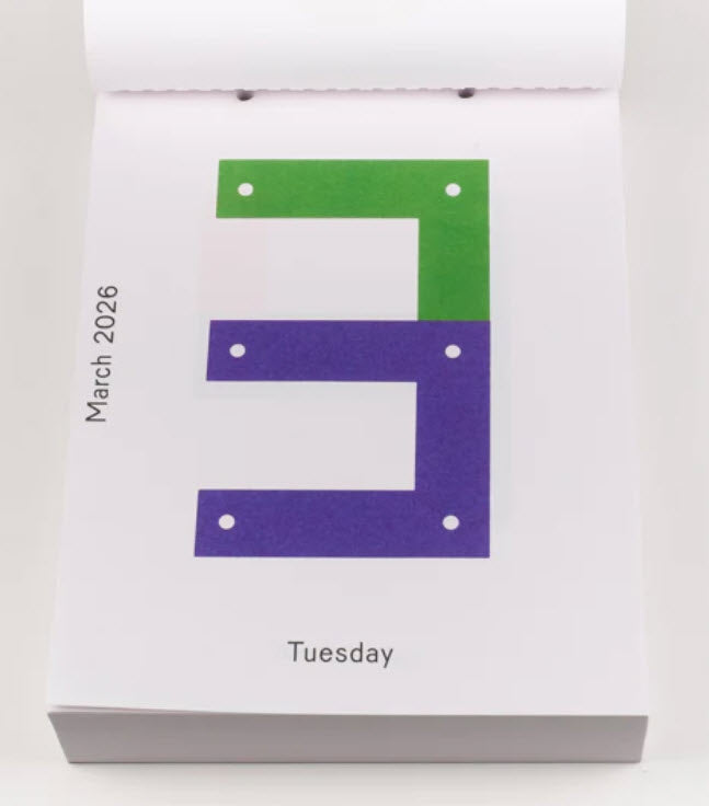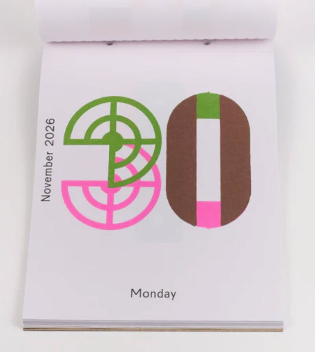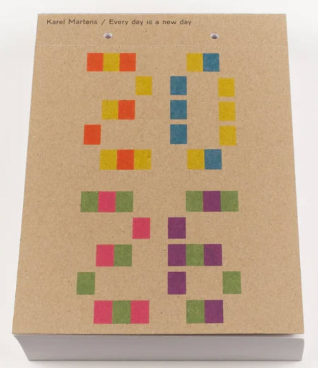 A tear-off calendar for 2026 by Dutch graphic designer Karel Martens. For each day of the year, Martens has created a unique arrangement, originally constructed using his signature method of printing letterpress monoprints from found metal forms, and then digitized to comprise 365 compositions in total. Every day is a new day!