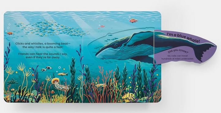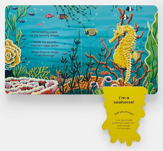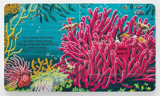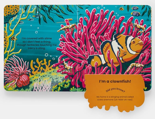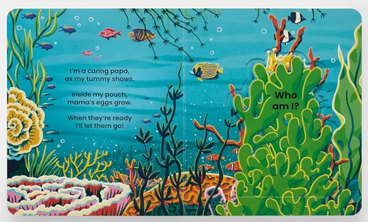On each spread, a hidden sea creature is described with a lively read-aloud rhyme, while peek-through details give extra clues to the animal's identity. Little hands can lift a satisfying, sturdy flap to reveal who's hiding under the sea. For example: Who carries mama's eggs in his belly? (Lift the flap - it's the seahorse!) Who's covered in slime so they don't feel stings? (Peek under - it's the clownfish!)